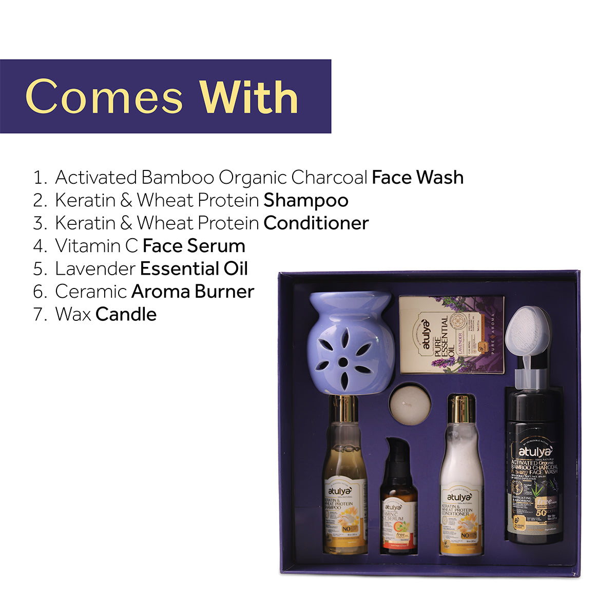 Ans. The Uphaar Gift Box contains Activated Bamboo Organic Charcoal Face Wash, Keratin & Wheat Protein Shampoo, Keratin & Wheat Protein Conditioner, Vitamin C Face Serum, Lavender Essential Oil, Rose Lip Balm, and Ceramic Aroma Burner.