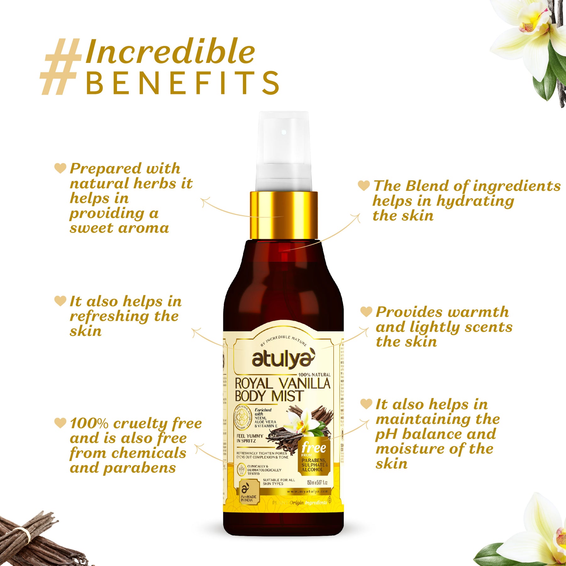 Indulge in the warm and luxurious aroma of Atulya Royal Vanilla Body Mist, designed to nourish, refresh, and uplift your senses. Enriched with the sweet essence of vanilla, this mist offers a soothing, comforting fragrance while hydrating your skin with a lightweight formula. Its subtle scent lingers throughout the day, making it a perfect companion for work, evenings, or casual outings. The mist not only refreshes the body but also helps calm the mind, leaving a cozy and inviting aura. Suitable for all skin types, it absorbs quickly without stickiness, offering instant hydration and long-lasting freshness. Free from parabens, sulfates, and harsh chemicals, it provides a safe and gentle everyday indulgence. Use it post-shower, before bed, or whenever you need a mood-lifting boost. Atulya Royal Vanilla Body Mist brings together nourishment and elegance, making every spritz a moment of self-care and luxury.